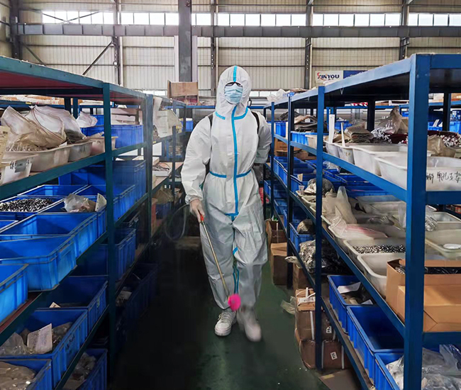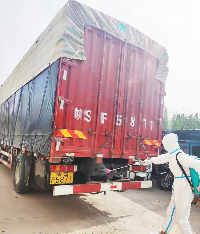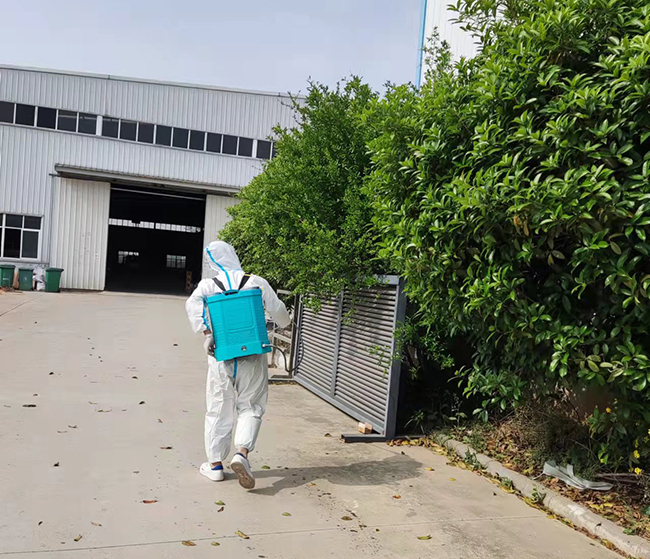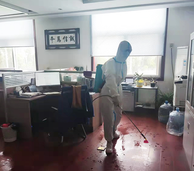 為確保公司各個部門在疫情期間的工作安全,防止疫情傳播,做好消毒防護工作,全公司進行了消毒消殺,消毒中為了不傷害員工身體健康,組織員工撤離現(xiàn)場,消毒人員佩戴口罩、乳膠手套、身穿防護服進行作業(yè)。
